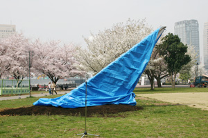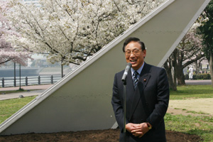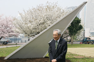 4月8日(水)みなとみらい運河パークにおいて、花時計の起工式が行われ、花を贈る日協議会、花時計プロジェクト実行委員会及び横浜青年会議所の同プロジェクト関係者が出席しました。会場中央に設置された日時計の除幕が行われると、通行人の方々が思わず足を止めてしまうほど、立派な日時計が姿を現しました。