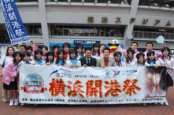 5月24日、横浜スタジアムにおいて第28回横浜開港祭のプロモーションが行われました。 プロ野球(セパ交流戦:横浜 vs 楽天)の試合前に、宝田横浜開港祭実行委員長を先頭に横浜開港祭広報渉外委員会メンバー、横浜開港祭親善大使、ハマー君がフィールド内を1周し、詰めかけた約15,000人の観衆の前で大いに横浜開港祭をPRしました。