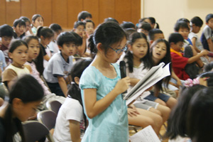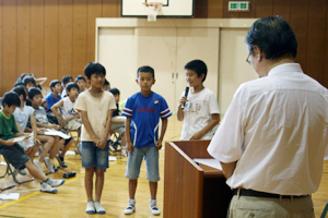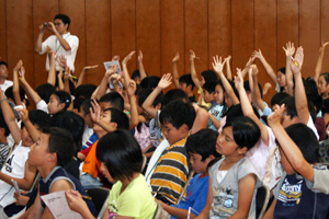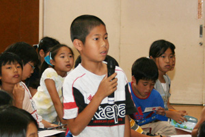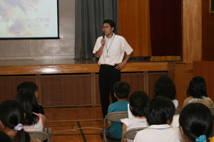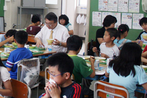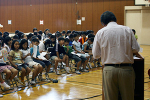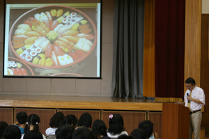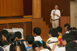 横浜市立荏子田小学校(青葉区)において、坂本一男先生(おさかな普及センター資料館館長)をお招きして、「はまっこスクール2009─輝き授業─」が開催されました。1年間の総合学習の一環として行う実地学習(清水市への宿泊学習)を直前に控えた5年生に、日本の水産業及び水棲生物等への問題意識を高めてもらうために、「水産物を通して環境を考える」をテーマに坂本一男先生に講演していただきました。セミナー終了後、坂本先生は子ども達との給食へ。坂本先生の子ども頃は給食がなかったということで、記念すべき給食初体験となりました。