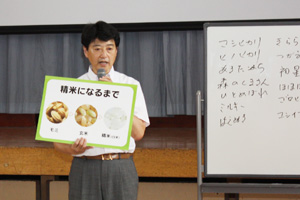 5年生の実施している米作り(農業)というテーマから、今回の夢先生には、京都宮津にて無農薬・手作業にて稲作をし、こだわりのお酢“富士酢”をつくり続けている飯尾氏と調布市にて明治38年創業の米屋(山田屋本店)の秋沢氏をお招きして、日本の主食である米について、こども達により深く知ってもらう事を目的に開催されました。