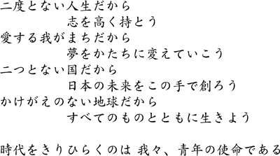 明日の時代、世界の平和に貢献できる我が国日本を、私たち青年でつくろうではないか。