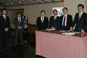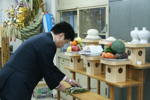 まだまだ肌寒くも素晴らしい晴天の冬空の下、伊勢山皇大神宮にて第29回横浜開港祭成功祈願祭が厳粛に執り行なわれ、横尾理事長を始めとする理事会構成メンバーと横浜開港祭室メンバーにて、横浜開港祭の成功を御祈祷しました。成功祈願祭が滞りなく執り行われた後、境内の階段にて集まったメンバー全員で毎年恒例となる集合写真を撮影致しました。そして開港祭事務局に速やかに移動し事務局開きが行なわれ、神主様による御祈祷の後、御神酒にて乾杯し、第29回横浜開港祭のスタートが切られました。
