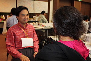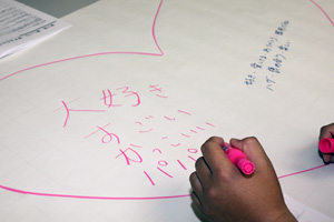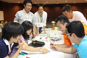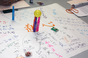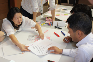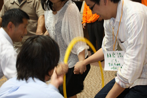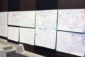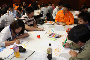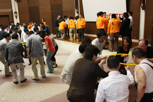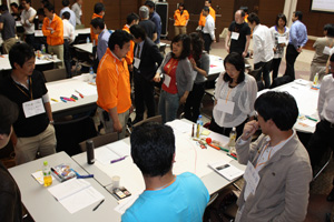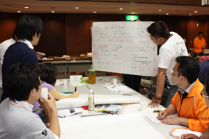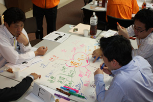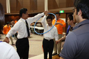 内容は、研修参加者60名を10のチームに分けて、フラループを利用した「チームワークとは?」や、「自分とは?」を見つめ直し、グループ内で「自分を発表する」プレゼンなど、実体験形式で研修内容が行われました。
