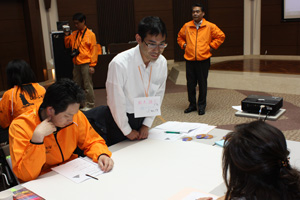 終日初夏を匂わせる晴天下の中、リーダーの資質を養う研修が行われ、翌日の寸劇発表のために夜通し稽古が行われました。
