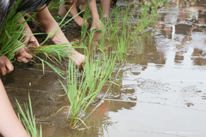 横尾理事長の挨拶のあと、引き続き子ども達に実際に田植えを体験していただき、土の感触や田植えの大変さなどを体感してもらいました。その後、JAやまがたおきたま青年部の山田勝様より農業の知識や農作道徳などについてご講義を頂きました。