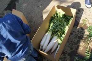 朝礼では講師の三枝氏、横尾理事長、奈良委員長よりご挨拶がありました。沢山できた大根を子供たちと一緒に収穫し、出荷に向けて水洗い・仕分け・梱包・袋詰めをしました。子供たちも一心不乱で作業に取り組んでおりました。また、収穫した後の畑をキレイにすべく雑草取りの作業を行い、昼食の前にみんなで敷地内の神社に収穫された大根を奉納しました。