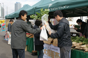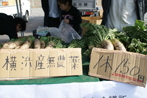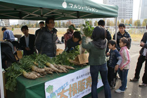 はまっ子スクール2010〜はまっ子畑の先生〜で作った大根の一部を、みなとみらい線新高島駅そばのマルシェ会場にて販売しました。当日は早朝5時より大根の収穫を行い、子供たち、K2のみなさん、JCメンバーにて手分けしてみんなで育てた大根の販売に精を出しました。天候にも恵まれ、10時から16時までたくさんの大根を販売することができました。
