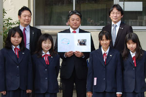受領は全校集会で行われ、6年生4名(現在は中学生)と新橋小学校生徒代表より宝田理事長が受領されました。