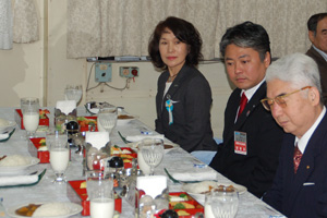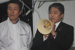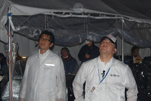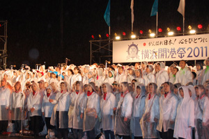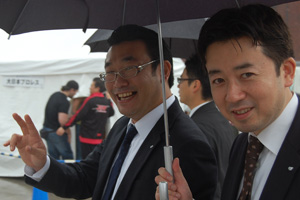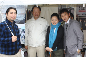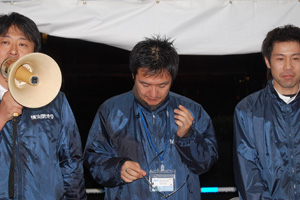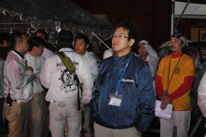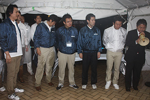 太田事務局長が朝礼の司会を務め、宝田理事長、佐藤副理事長、金澤実行委員長、今井総務委員長、岡本企画運営委員長、伊藤広報渉外委員長の挨拶、並びに注意事項の告知が行われ、掛け声と共に一致団結の意思を表しました。雨が降る中でしたが、被災地支援ブースの設置、新しいイベント企画、欽ちゃんの来演等を開港祭公式HPの広報戦略によって多くの方にご来場いただくことができました。