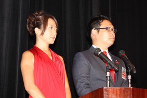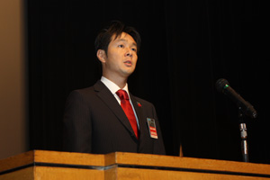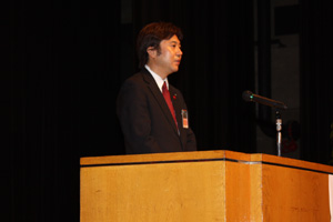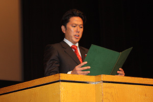 (社)横浜青年会議所が戦後日本の復興と横浜の為に役立ちたい志から設立した経緯や過去60年間の諸先輩方が挑戦した運動の説明(映像)の後、宝田理事長による挨拶が行われました。横浜の青年実業家として、過去60年に渡る数々の「まちづくり」「ひとづくり」の政策や発信し続けている運動や検証について説明され、これからも横浜が発展する礎を築き「横浜ブランド」の確立を目指して横浜青年会議所運動を継続していく事、また10年のビジョンとして「共感」思いの維がるまち横浜を宣言致しました。