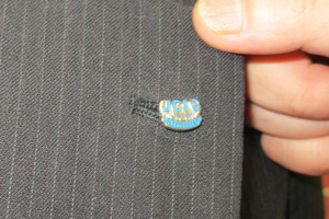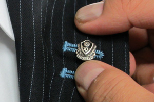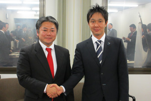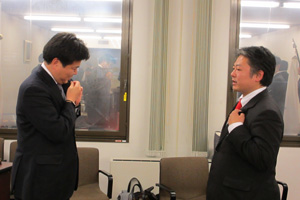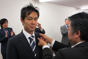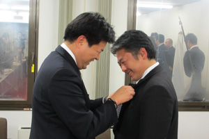 理事会終了後、宝田理事長から岡部次年度理事長へ歴代理事長バッヂが、横尾直前理事長から宝田理事長へ歴代直前理事長バッヂが厳粛に授与されました。
