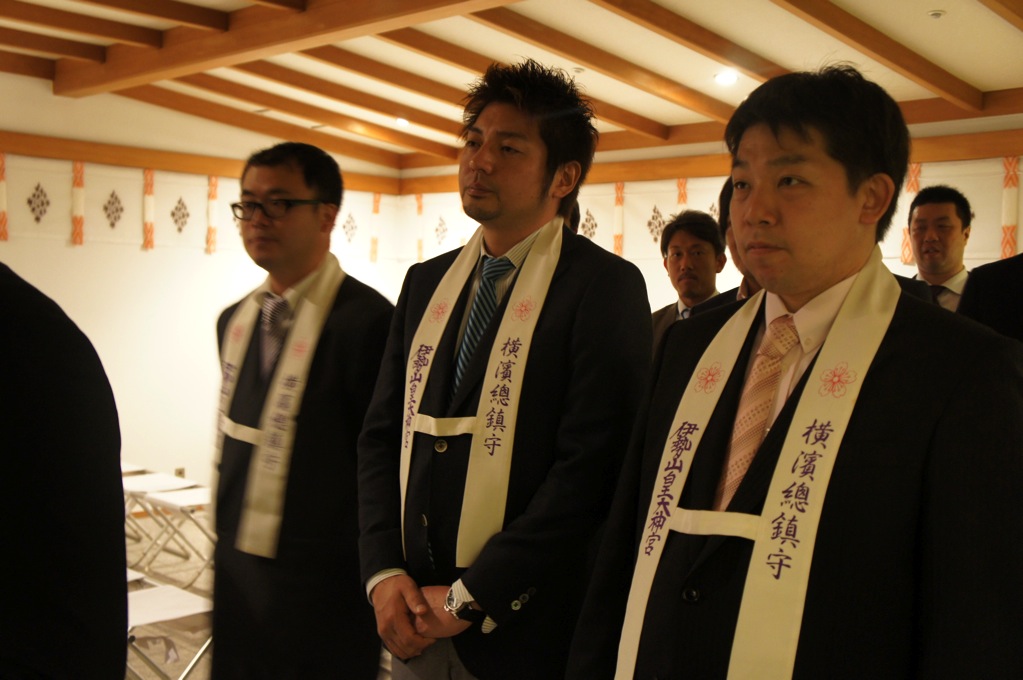 第31回横浜開港祭の会期中の晴天と無事故を祈願する晴天祈願祭が伊勢山皇大神宮新宮殿(横浜市西区)にて執り行われ、横浜開港祭室をはじめ、正副理事長、理事者が参加しました。