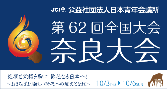 (公社)日本青年会議所による、第62回全国大会奈良大会が奈良市内にて「気概と覚悟を胸に勇壮なる日本へ!!~まほろばより新しい時代への燈火となれ!~をテーマに開催されます。 ■大会概要■ 【主催 …