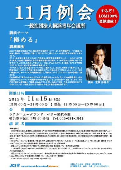 2013年10月16日(水) PM06:00~PM09:00(予定) 横浜市開港記念会館 9号室神奈川県横浜市中区本町1−6045-201-0708 後援講師・関係先(公社)日本青年会議所JCプログラム実践委員会、JC …