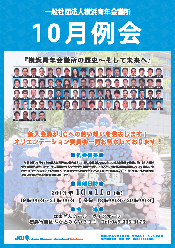 本年度9月例会では、バージョンアップ-個人・組織の魅力向上-をテーマに、2014年度(一社)横浜青年会議所の中核を担う役員候補者の紹介並びに、2014年度理事候補者としての思いを発信する・・・続きを読む