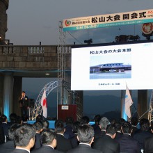 松山市総合公園(展望広場)において、開会式を行いました。開会式では、歌と太鼓によるオープニングアトラクション後、鈴木会頭の挨拶から始まり公益社団法人 松山青年会議所 西村直樹理事長の挨拶、愛媛県知事 中村時広様、松山市長 野志克仁様、ご来賓の方々より挨拶がございました。