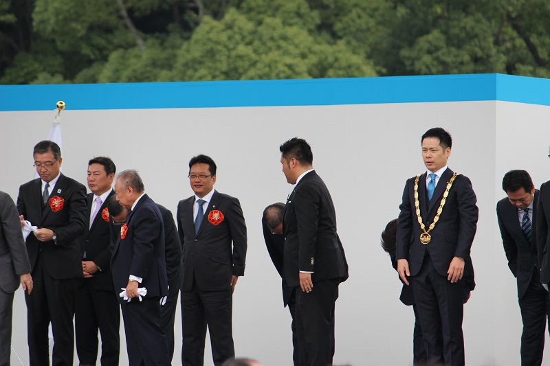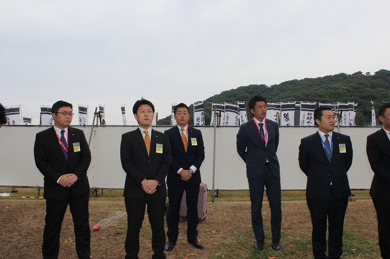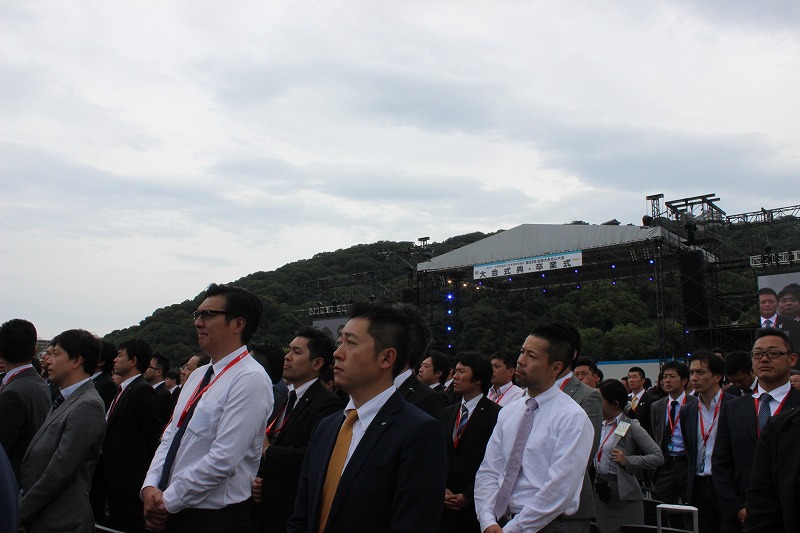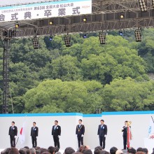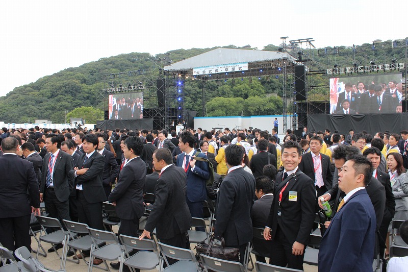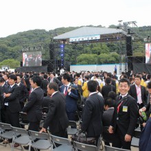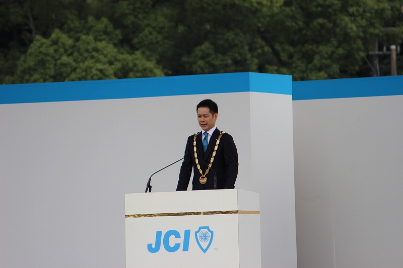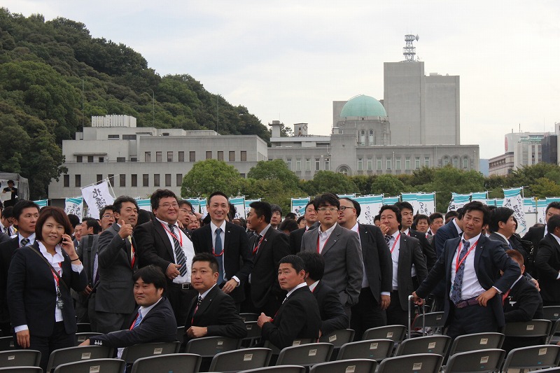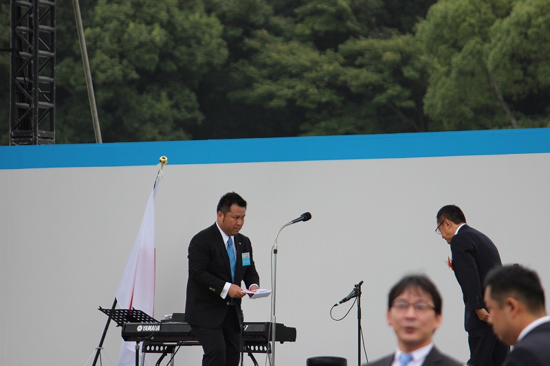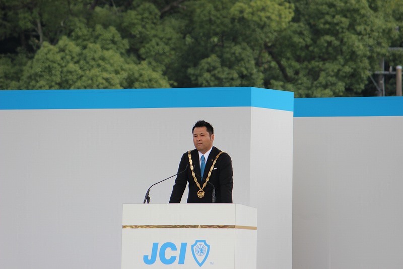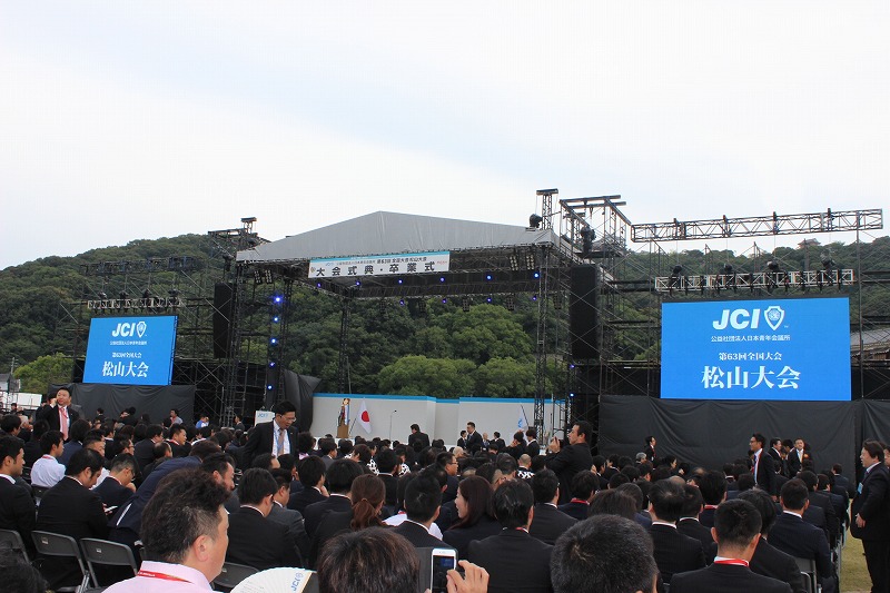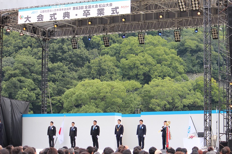 愛媛県松山市城山公園~堀之内~(ふれあい広場)にて第63回全国大会松山大会の大会式典を開催しました。会頭鈴木和也君によるメインスピーチにおいて、本年度の総括が行われました。その後歴代会頭による第65代会頭予定者 柴田剛介君へのプレジデンシャルリースの伝達、公益社団法人松山青年会議所より公益社団法人八戸青年会議所への第64回全国大会東北八戸大会への「大会の鍵」の伝達が行われました。