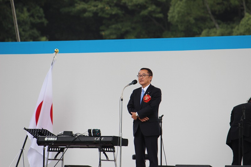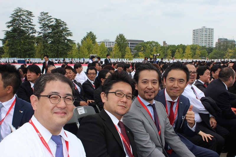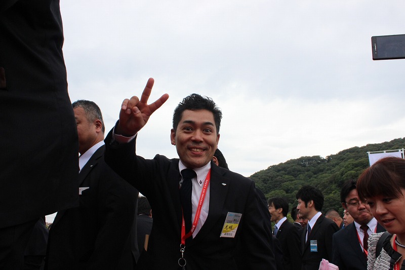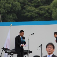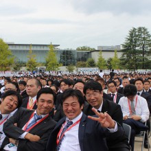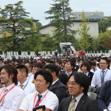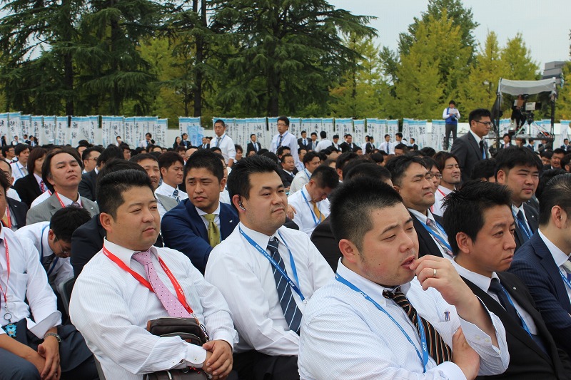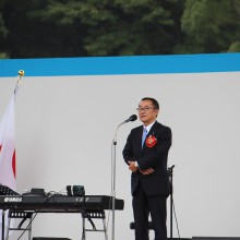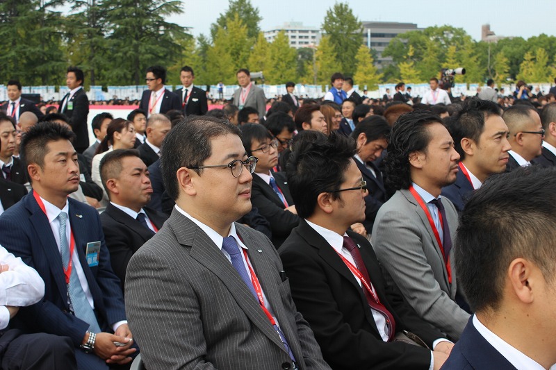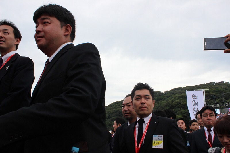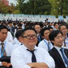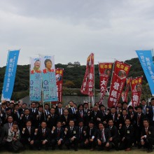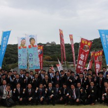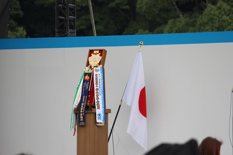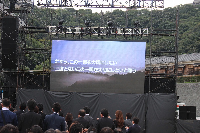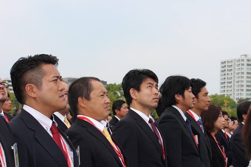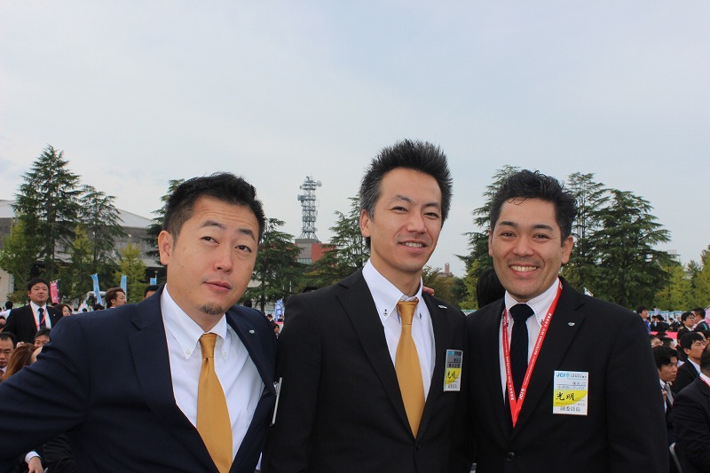 愛媛県松山市城山公園~堀之内~(ふれあい広場)にて第63回全国大会松山大会の大会式典を開催しました。会頭鈴木和也君によるメインスピーチにおいて、本年度の総括が行われました。その後歴代会頭による第65代会頭予定者 柴田剛介君へのプレジデンシャルリースの伝達、公益社団法人松山青年会議所より公益社団法人八戸青年会議所への第64回全国大会東北八戸大会への「大会の鍵」の伝達が行われました。