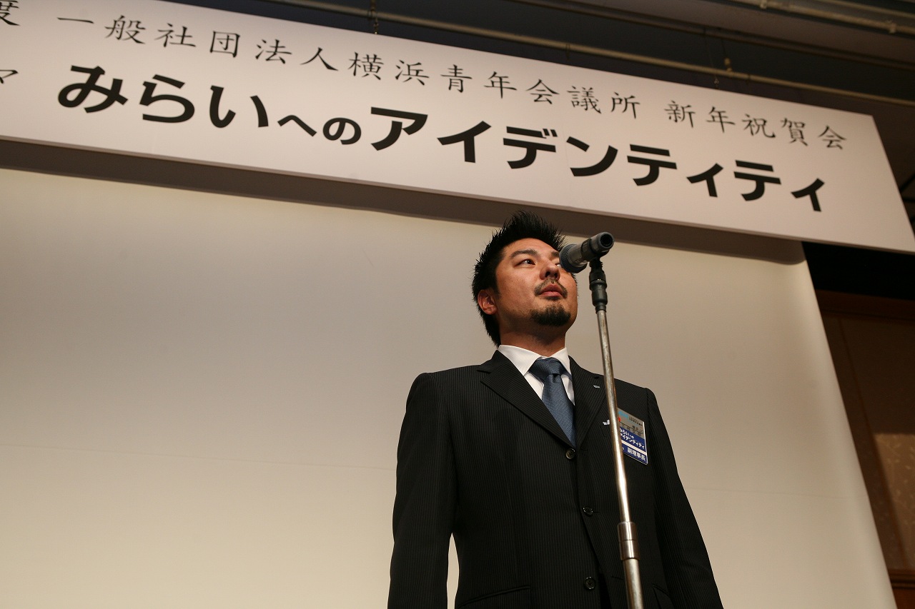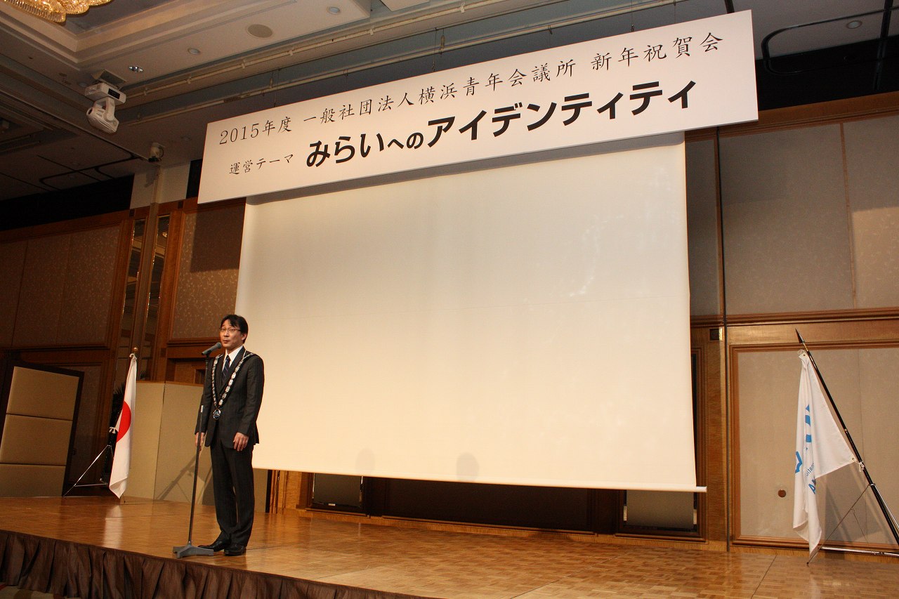 新年式典では、稲葉崇浩理事長より所信表明が行われました。本年度の運営テーマは「みらいへのアイデンティティ」、ご来賓の皆様、来訪JC、特別会員、メンバーに向けて、本年度の横浜青年会議所の方向性が発信されました。