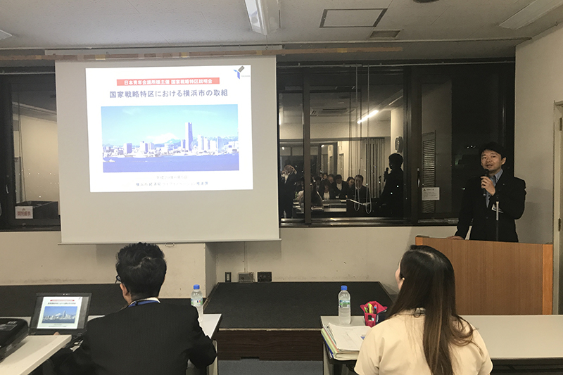 当事業は「横浜市における国家戦略特区の取組み・活用術」をテーマとして、国家戦略特区の基本方針・概要や横浜市の取組み事例などを中心に説明会が行われました。