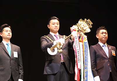「式典の部」では(公社)日本青年会議所 青木照護会頭から、次年度会頭予定者 池田祥護君へプレジデンシャルリースの伝達が行われ、本年度の運動総括及び2018年度への抱負が語られました。