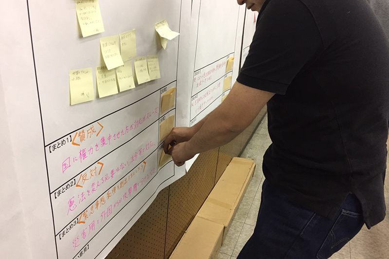 『今話題になっている憲法改正とはなんなのか?』を、テーマ1では【大規模な自然災害発生に向けて、緊急事態条項を創設すべきという意見がありますがどう思いますか】、テーマ2では【憲法9条に自衛隊の立ち位置を明記するという意見がありますが、どう思いますか】と2つのテーマに絞り、日本の私たちの将来について、グループワークでのディスカッション形式で楽しく憲法を学び、討議が行われました。