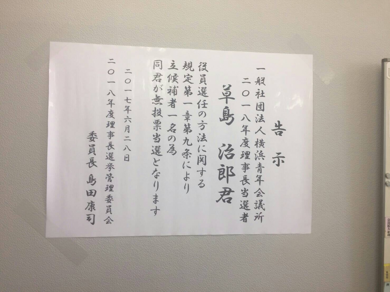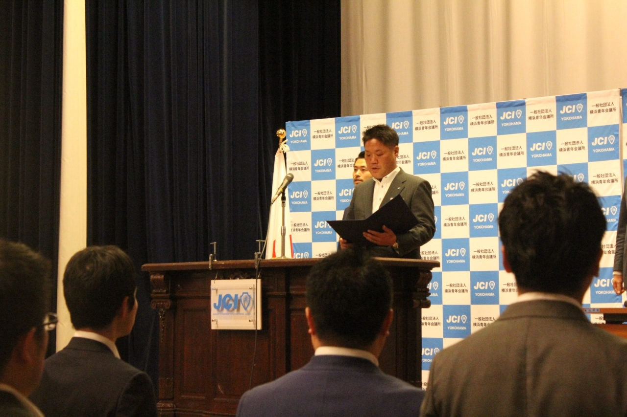 一般社団法人横浜青年会議所2018年度理事長立候補者届出期間中に草島治郎 君1名の立候補の届出がなされました。理事長選挙管理委員会は「役員選任の方法に関する規定」第7条及び第9条により厳正なる資格審査の結果、草島治郎君が無投票当選したことを報告し、意見交換会を開港記念会館で行いました。