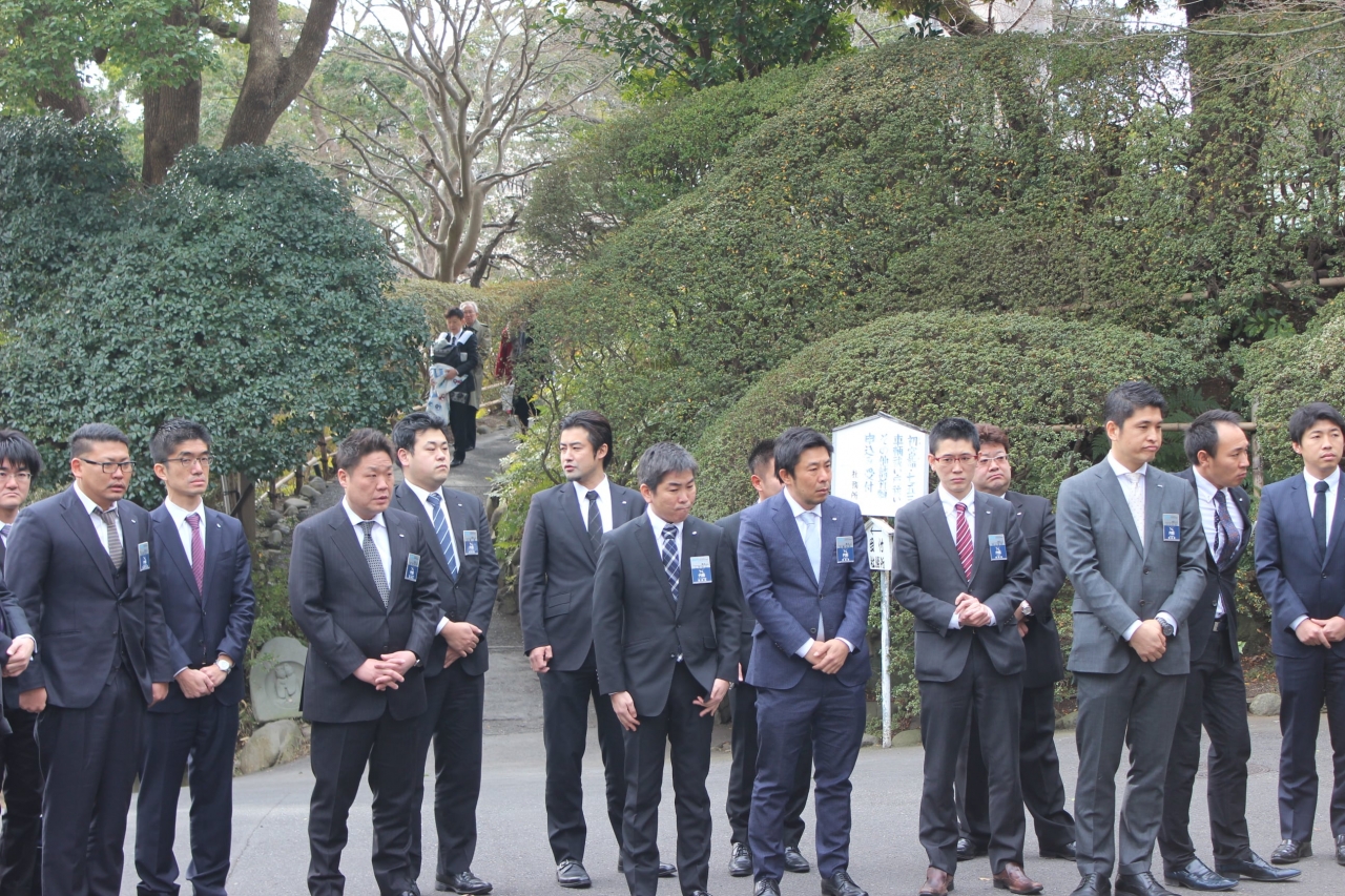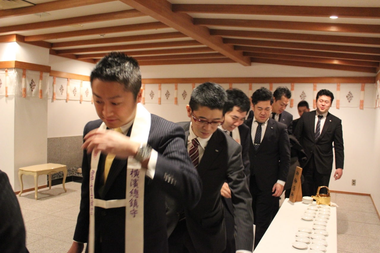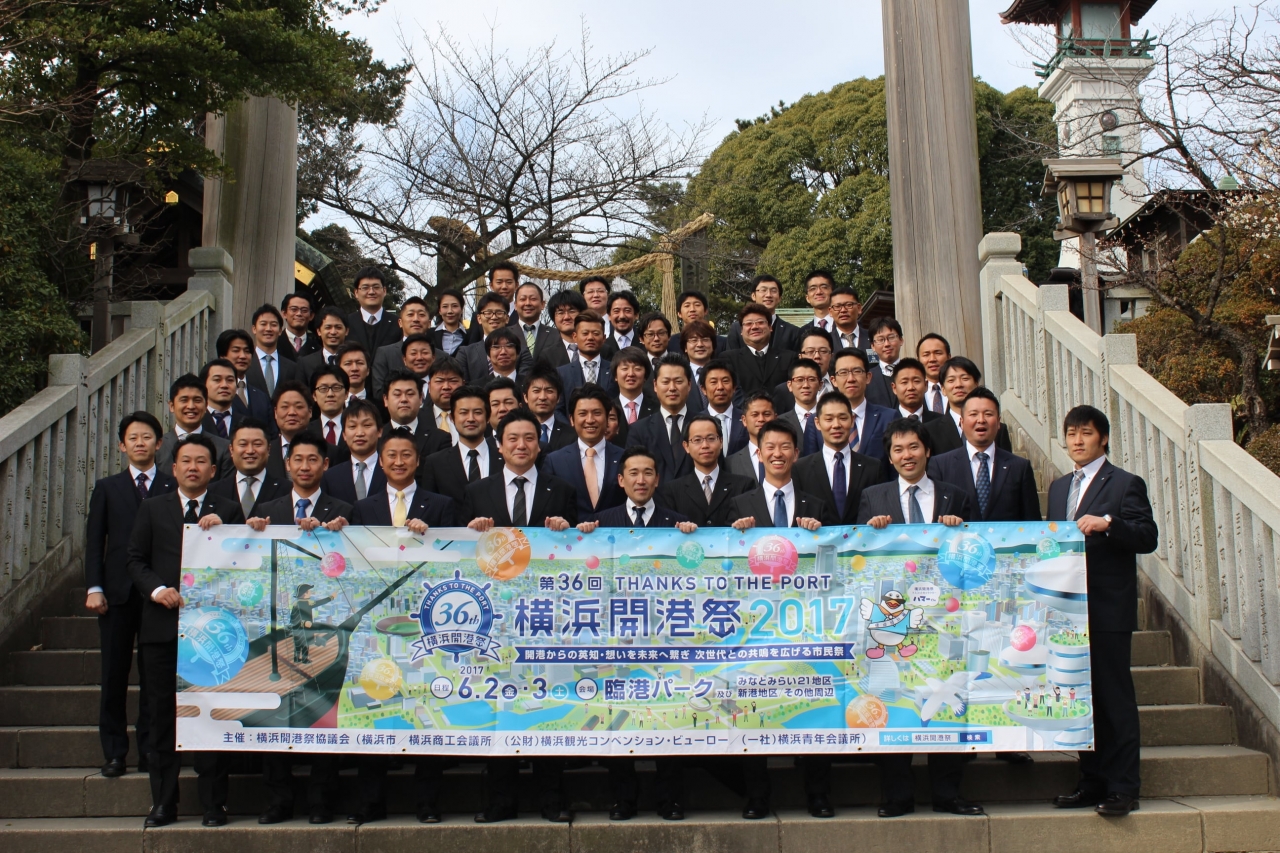【第36回横浜開港祭 成功祈願祭】まだまだ肌寒くも晴天の冬空の下、伊勢山皇大神宮にて第36回横浜開港祭成功祈願祭が厳粛に執り行なわれ、森理事長を始めとする理事会構成メンバーと横浜開港祭室メンバーにて、横浜開港祭の成功を御祈祷しました。成功祈願祭が滞りなく執り行われた後、境内の階段にて集まったメンバー全員で毎年恒例となる集合写真を撮影致しました。そして開港祭事務局に速やかに移動し事務局開きが行なわれ、神主様による御祈祷の後、御神酒にて乾杯し、第36回横浜開港祭のスタートが切られました。