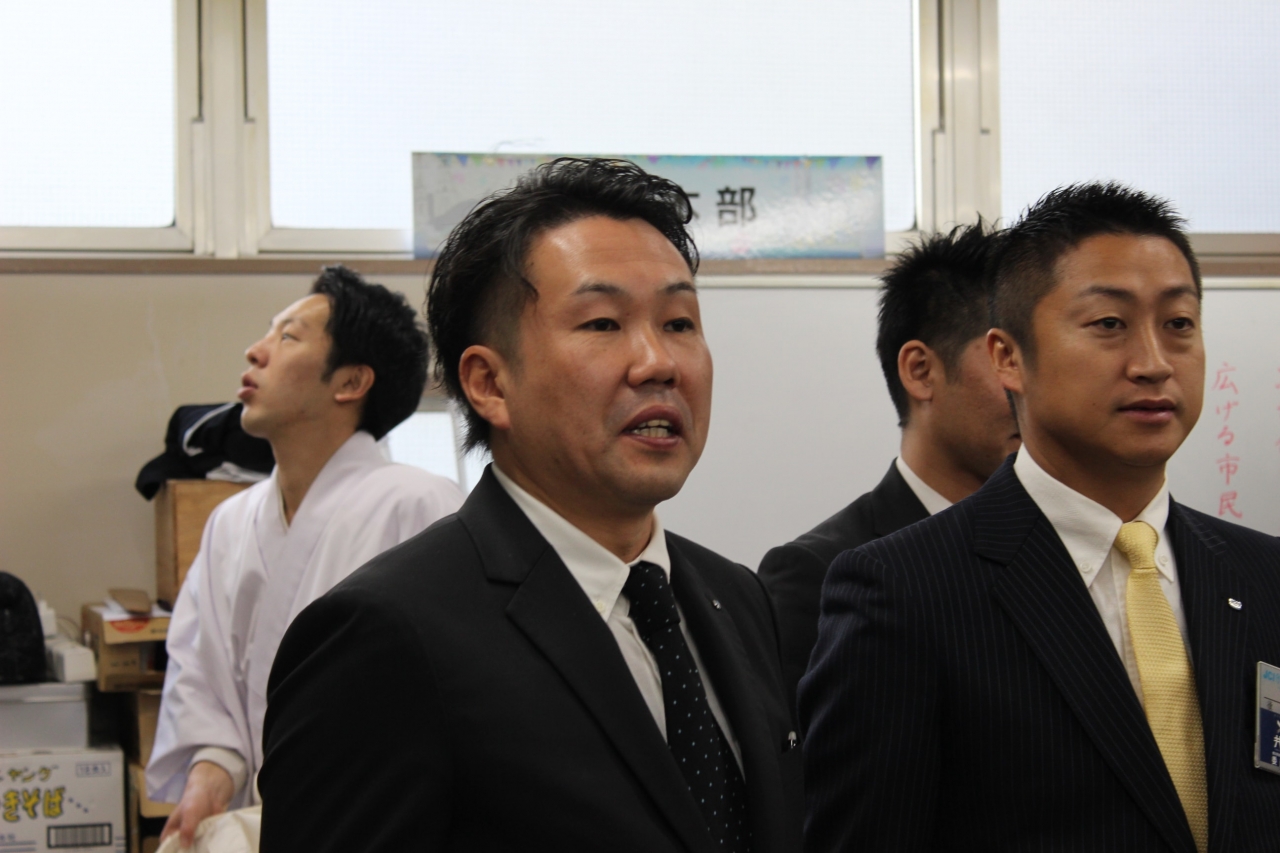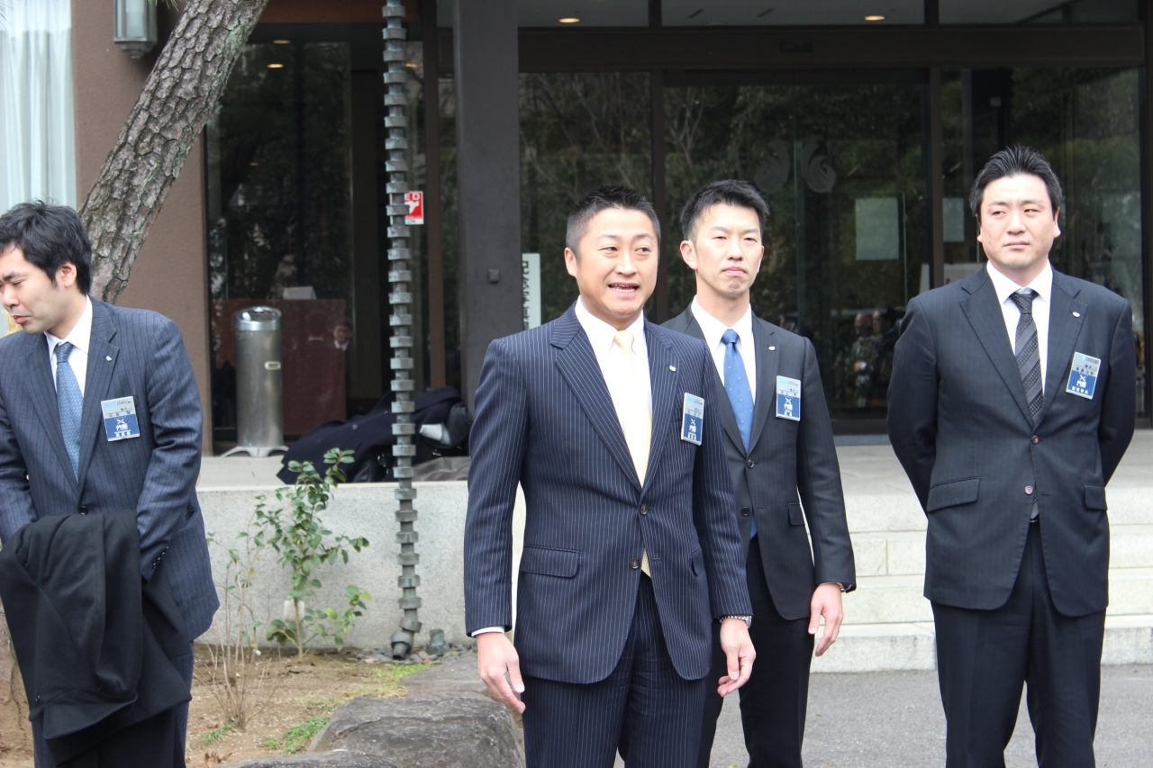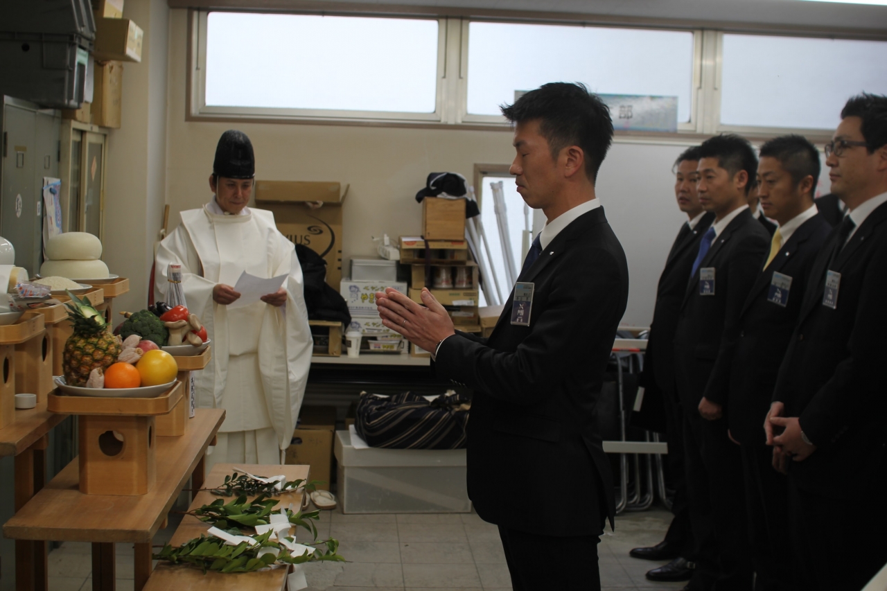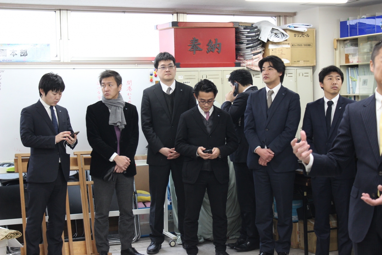 【第36回横浜開港祭 成功祈願祭】まだまだ肌寒くも晴天の冬空の下、伊勢山皇大神宮にて第36回横浜開港祭成功祈願祭が厳粛に執り行なわれ、森理事長を始めとする理事会構成メンバーと横浜開港祭室メンバーにて、横浜開港祭の成功を御祈祷しました。成功祈願祭が滞りなく執り行われた後、境内の階段にて集まったメンバー全員で毎年恒例となる集合写真を撮影致しました。そして開港祭事務局に速やかに移動し事務局開きが行なわれ、神主様による御祈祷の後、御神酒にて乾杯し、第36回横浜開港祭のスタートが切られました。