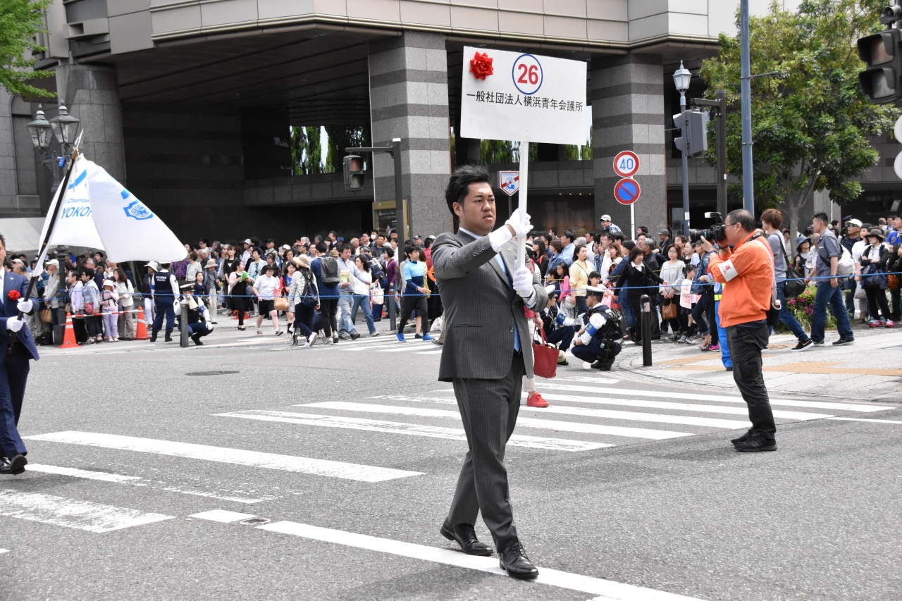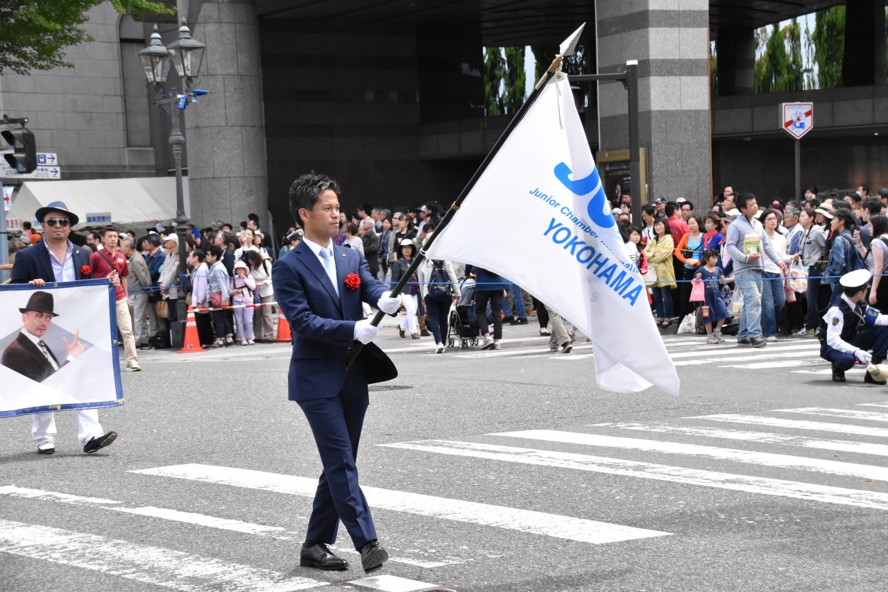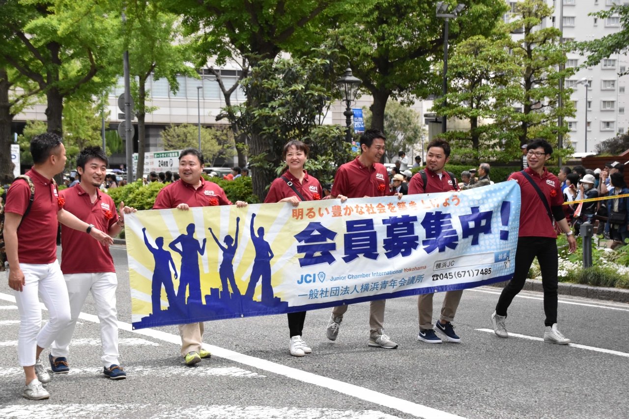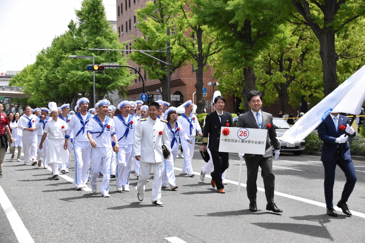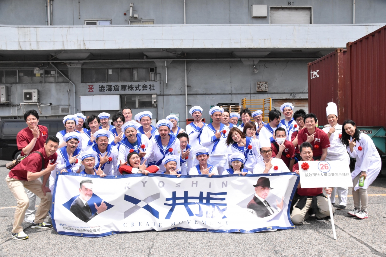 当日は38万人もの横浜市民が沿道で声援を送る中、(一社)横浜青年会議所は水夫に仮装した新入会員の