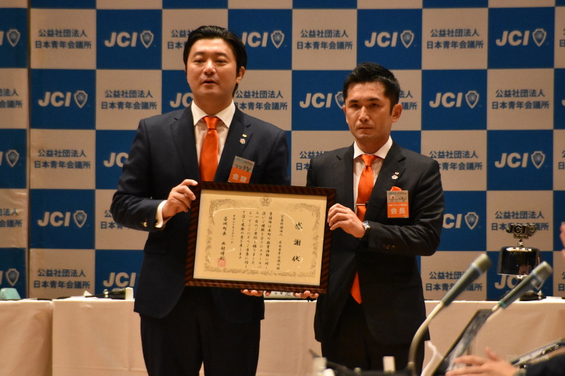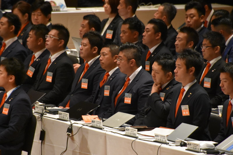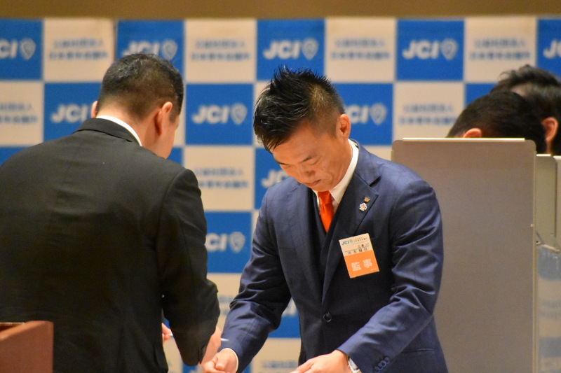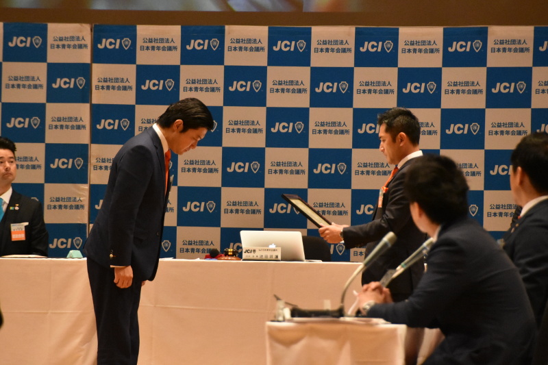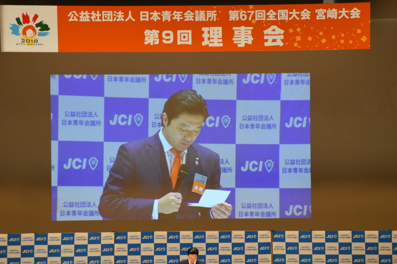 宮崎の地にて理事会・総会が執り行われ、「大会式典 式典の部」では(公社)日本青年会議所 池田祥護会頭から、次年度会頭予定者 鎌田長明君へプレジデンシャルリースの伝達が行われ、本年度の運動総括及び2019年度への抱負が語られました。