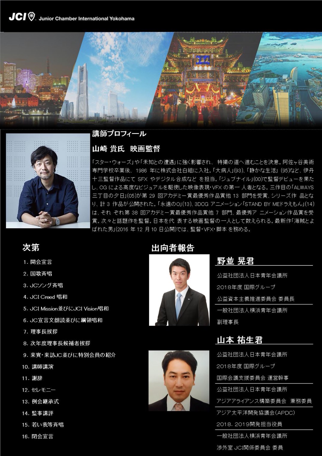 内容:講師に山崎貴氏をお呼びし、2018年度例会の集大成として理事長の想いと「横濱愛」を強く発信して頂き、2020年世界会議誘致を始めとした一般社団法人横浜青年会議所の今後の各事業に向けてメンバー一人ひとりに明確なビジョンを持って頂ける様な例会と致します。