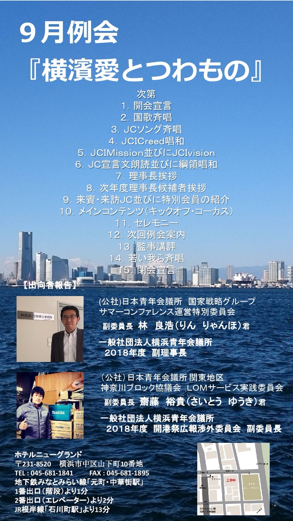 横濱愛をメンバー全員に周知、理解をして頂くと共に理事長の考えや想いを受け止め、青年会議所の方向性を共有する場として9月例会を開催致します。勇気と強さを兼ね備えたつわものと呼ばれた先人からバトンを渡されてきた。そしてまたバトンを受け渡す時が来る。横濱愛を胸に秘め挑戦し、新たなつわものを生み出す機会となります。