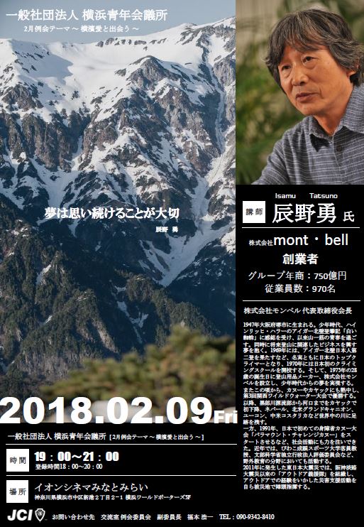「横濱愛」とは、無償の愛情です。親が子にかける見返りを求めない愛です。2月例会では、講師に株式会社モンベル代表取締役会長 辰野勇様をお招きし、辰野様の考える「無償の愛」と草島理事長の考える「横濱愛」を重ね合わせ、我々が追い求める愛の形を感じて頂く例会に致します。