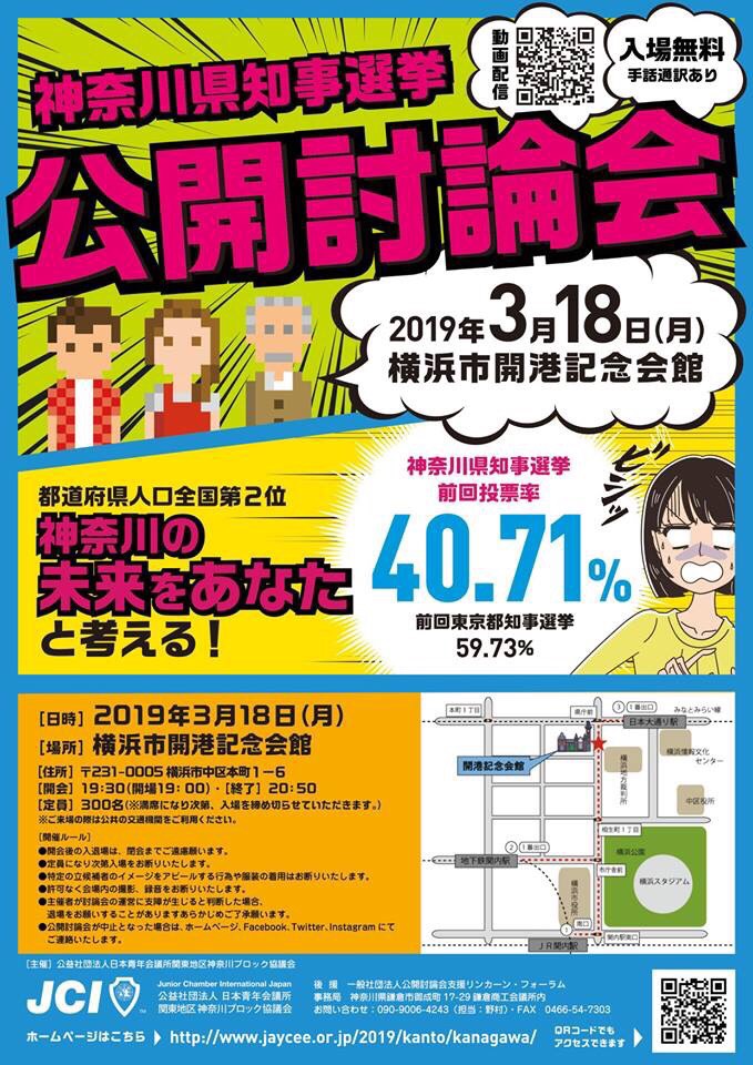 (公社)日本青年会議所関東地区神奈川ブロック協議会主催の神奈川県知事選挙の公開討論会が開催されます。