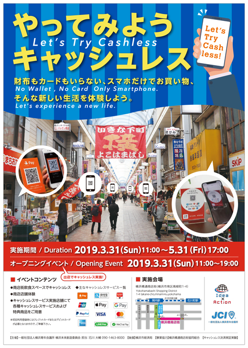 この度、一般社団法人横浜青年会議所は、横浜市南区の横浜橋通商店街内にて、「キャッシュレス決済実証実験」を実施する事となりました。近年、郊外型商業施設の増加や少子・高齢化等の社会構造の変化等、地域経済を巡る環境は大きく変わっており、事業競争が激しくなっております。地域経済が社会構造の変化の中で発展していく為には、地域の中で消費活動を活発化させ、資金を循環させる事により、地域における経済活動の循環型社会を促進させる必要があります。そこで、キャッシュレス決済の実証実験を行い、円滑なお金の流れを生む事が出来るかどうか検証し、キャッシュレス決済の導入促進に繋がるか検証致します。